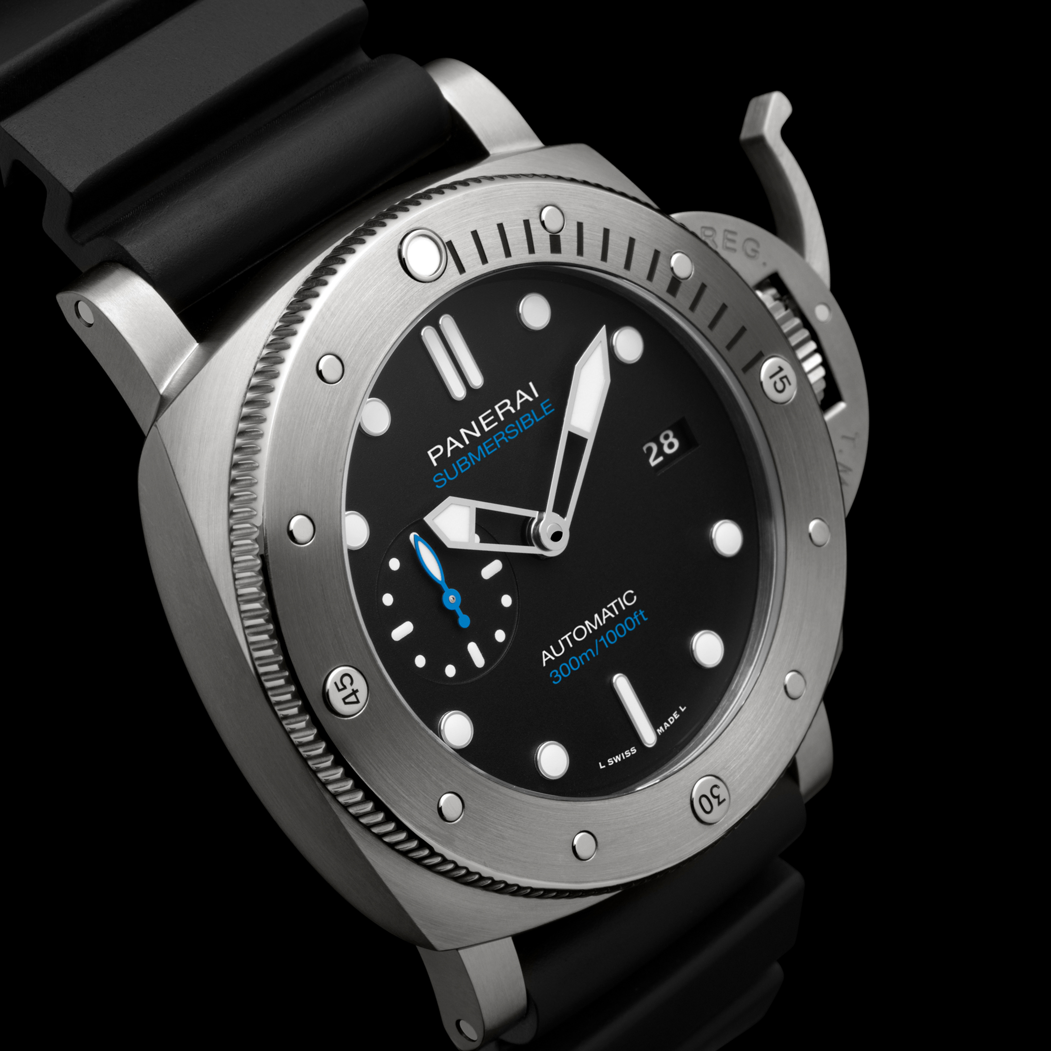 With the Submersible, Panerai renews with its great tradition of epic exploits in the depths of the sea. The design of the bezel is inspired by that of the watch created by Officine Panerai in 1956 for the Egyptian Navy known as “L’Egiziano”. This was an exceptionally large and robust watch with a case diameter of 60 millimeters.